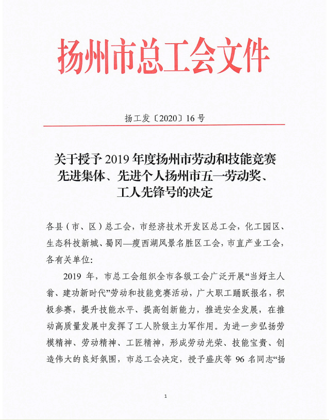 公司3名员工获扬州市总表彰