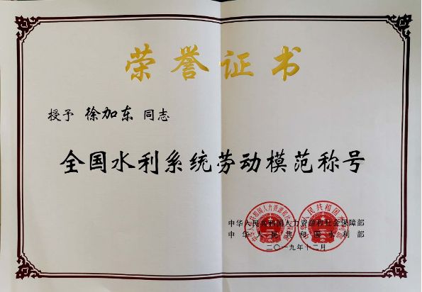 徐加东荣获“全国水利系统劳动模范”称号